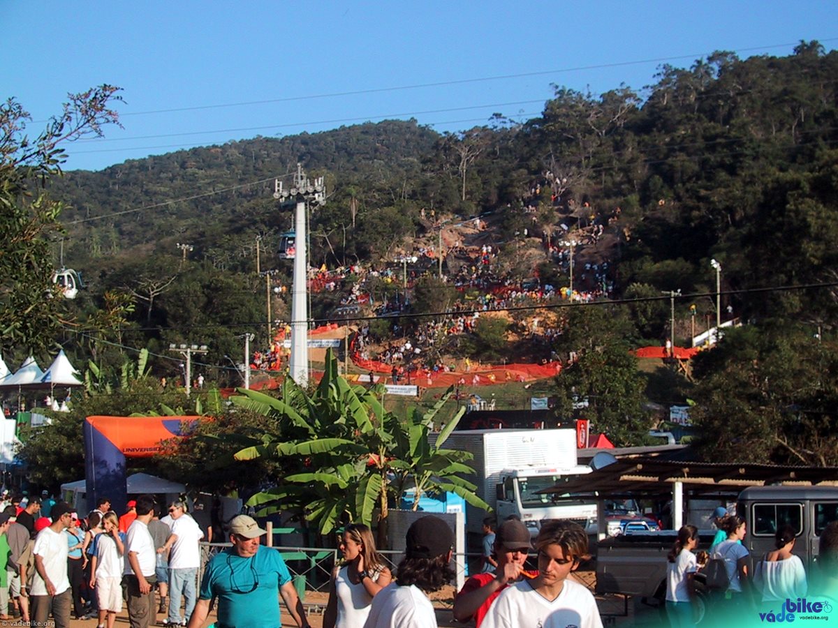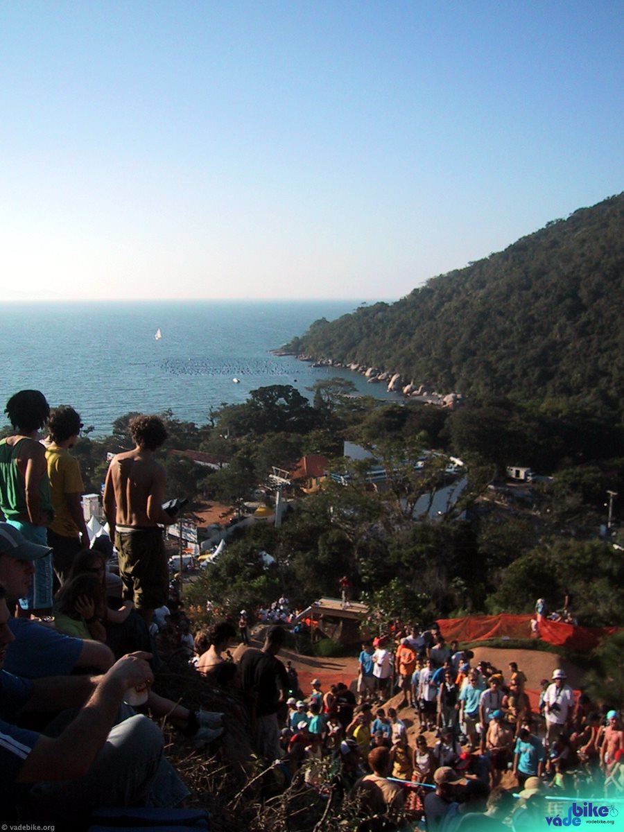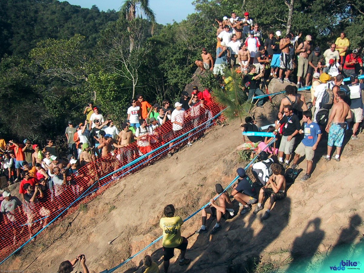 Depois que eu já tinha encontrado um monte de gente, almoçado, conseguido guardar a bicicleta e passado em todos os estandes da feira, resolvi subir o morro. O Markohlf tinha acabado de descer e tinha feito o segundo melhor tempo. O pessoal ficava em silêncio esperando a divulgação do resultado de cada um que se jogava depois dele, comemorando cada resultado, sempre inferiores ao dele.