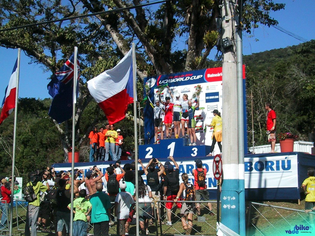 Pódio do XCO feminino na World Cup de Mountain Bike, em Balneario Camboriu (2005). Foto: Willian Cruz/VdB