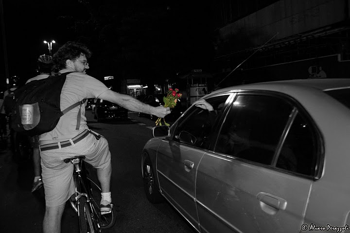E mesmo sem existir uma liderança formal, é impossível não notar uma organização coletiva, fluida, natural e orgânica. Presenciei dezenas de pessoas que participavam pela 1ª vez da Massa Crítica fazendo “corking” , distribuindo flores e sorrisos a motoristas e pedestres! MÁGICO!