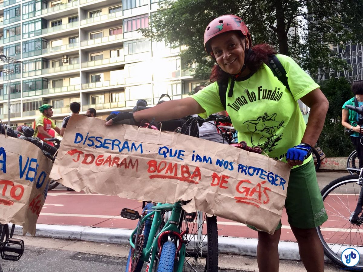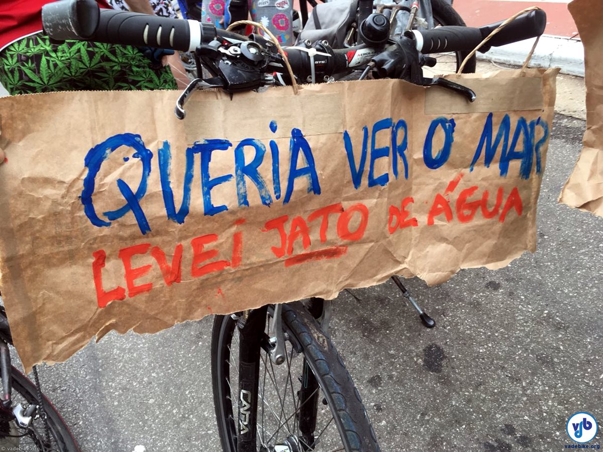 Faixa de protesto durante Bicicletada que questionou a repressão a ciclistas na descida a Santos de 2017. Foto: Silvia Ballan/Vá de Bike