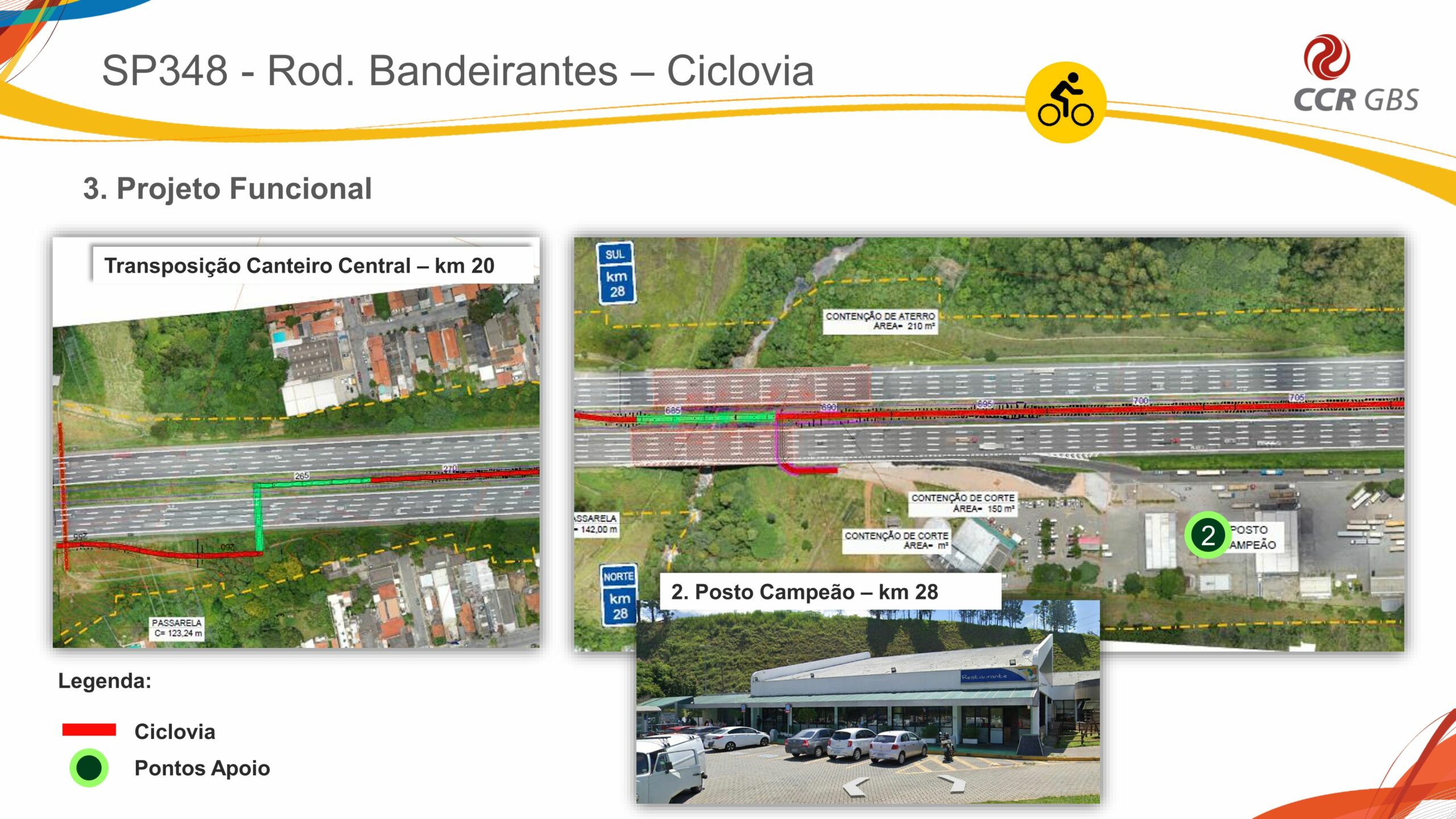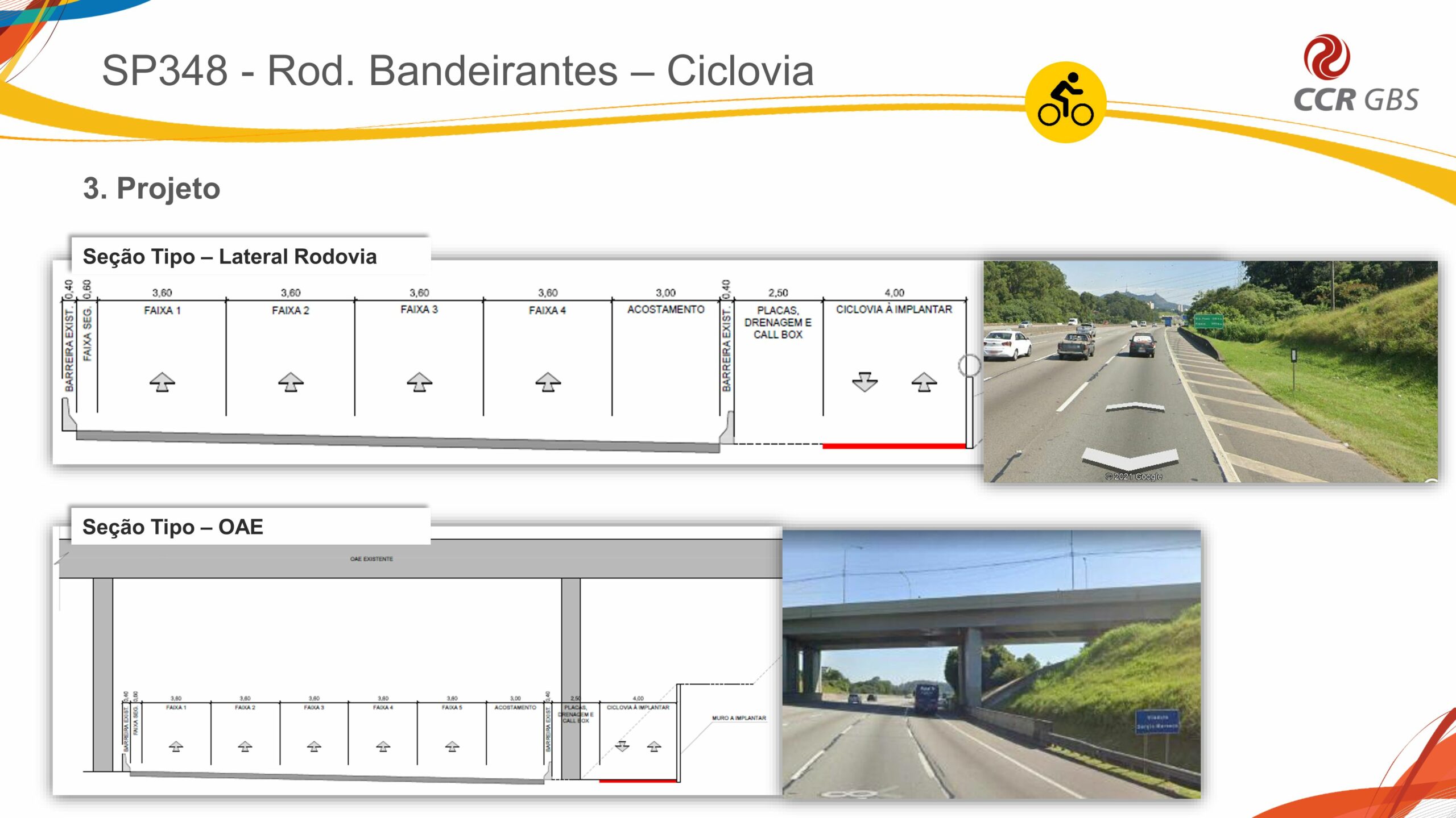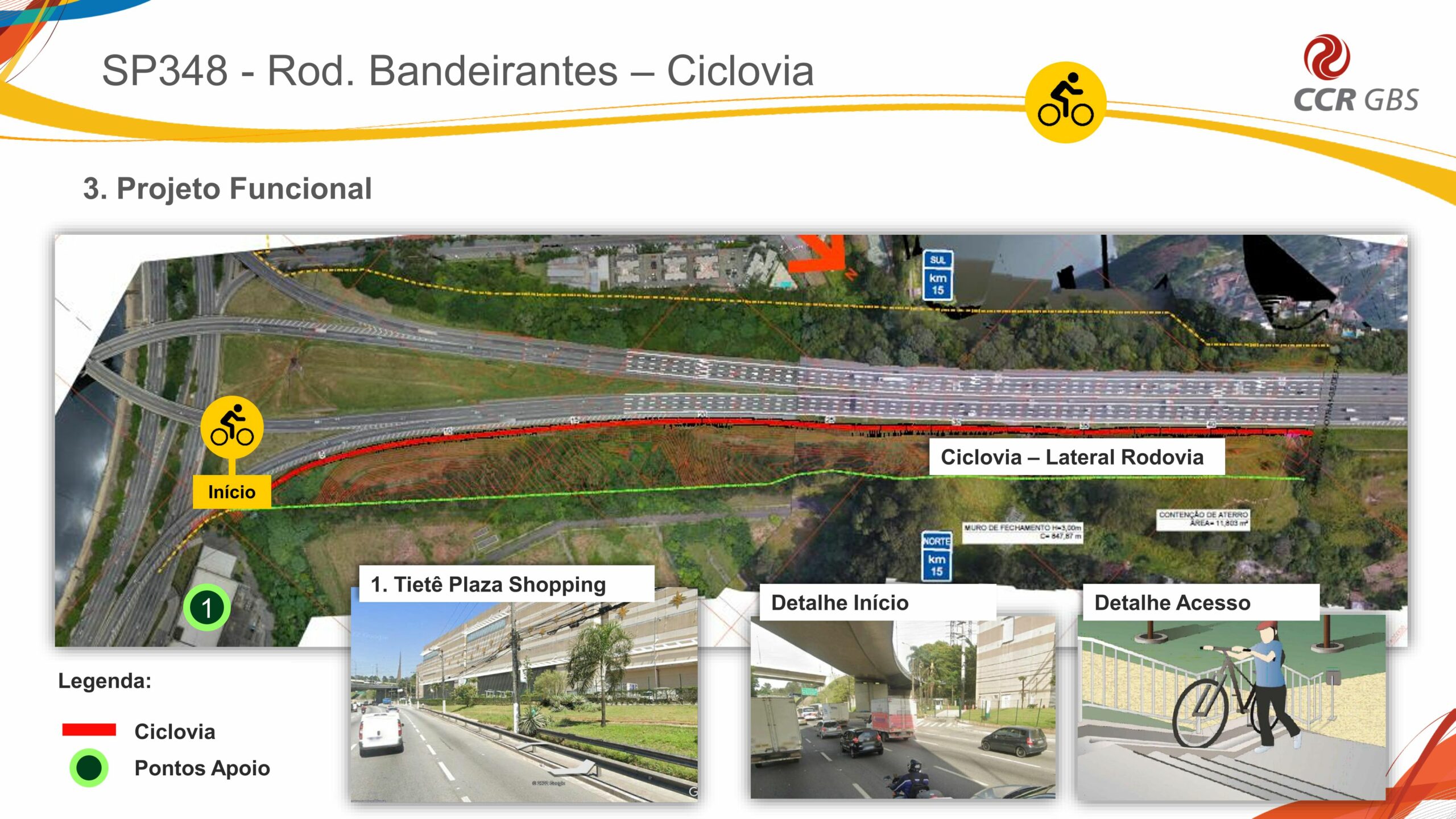 O Vá de Bike teve acesso a um documento que teria sido produzido pela própria CCR, apresentando o projeto funcional dessa ciclovia. O arquivo dessa apresentação tem 12 páginas, com dez delas mostrando detalhes do projeto da ciclovia da Rodovia dos Bandeirantes.