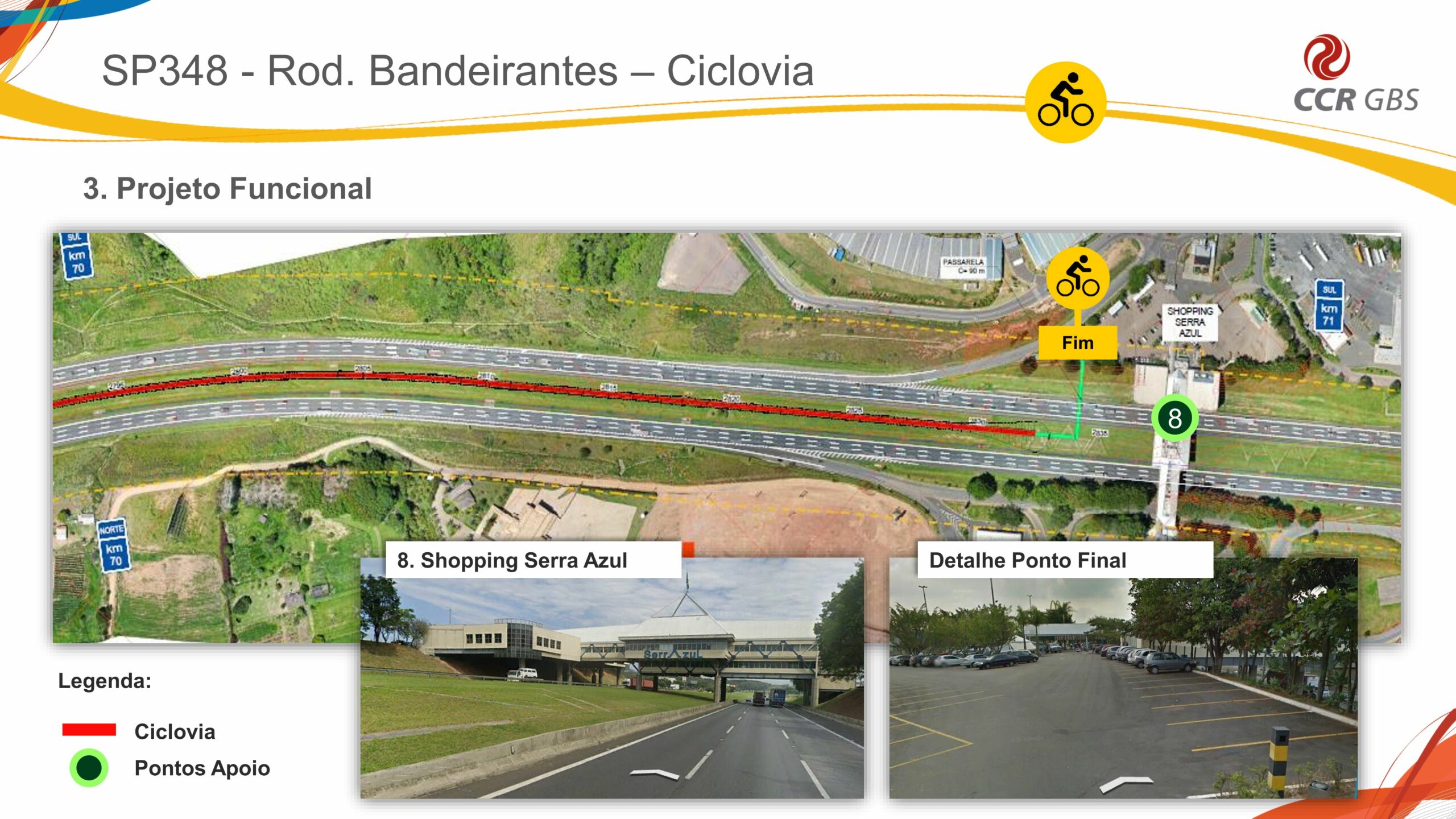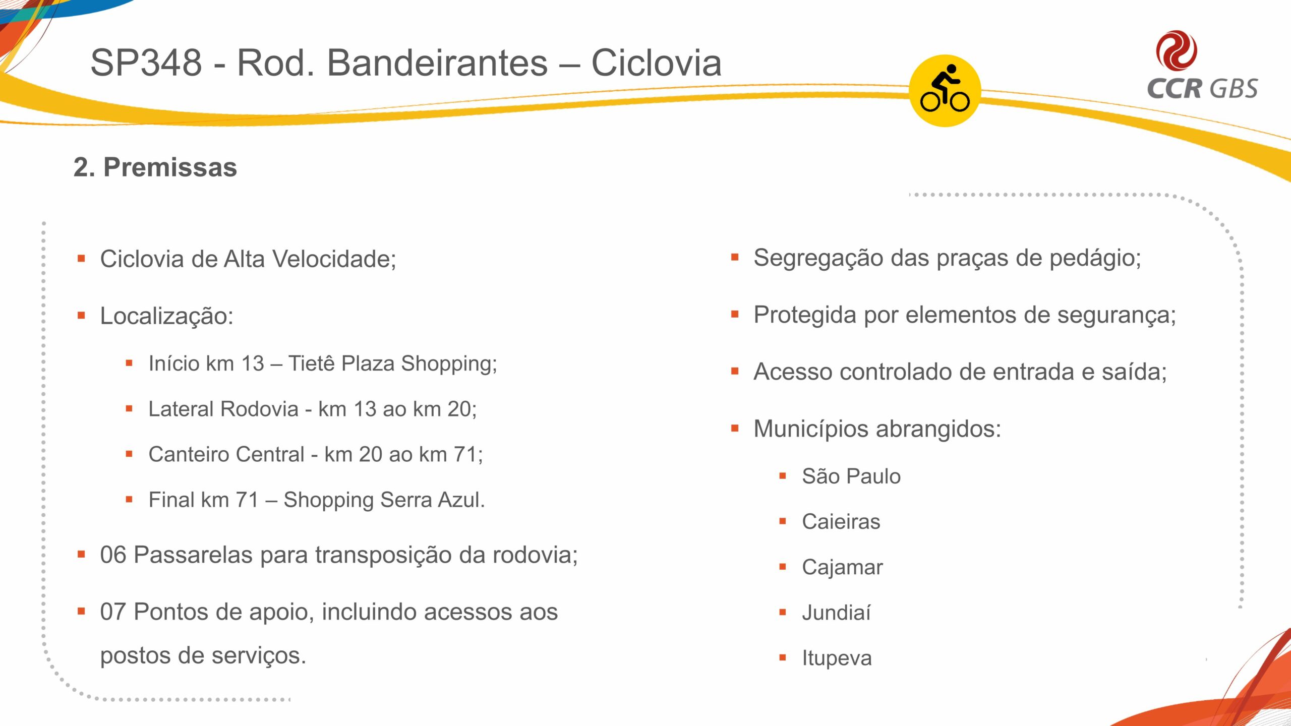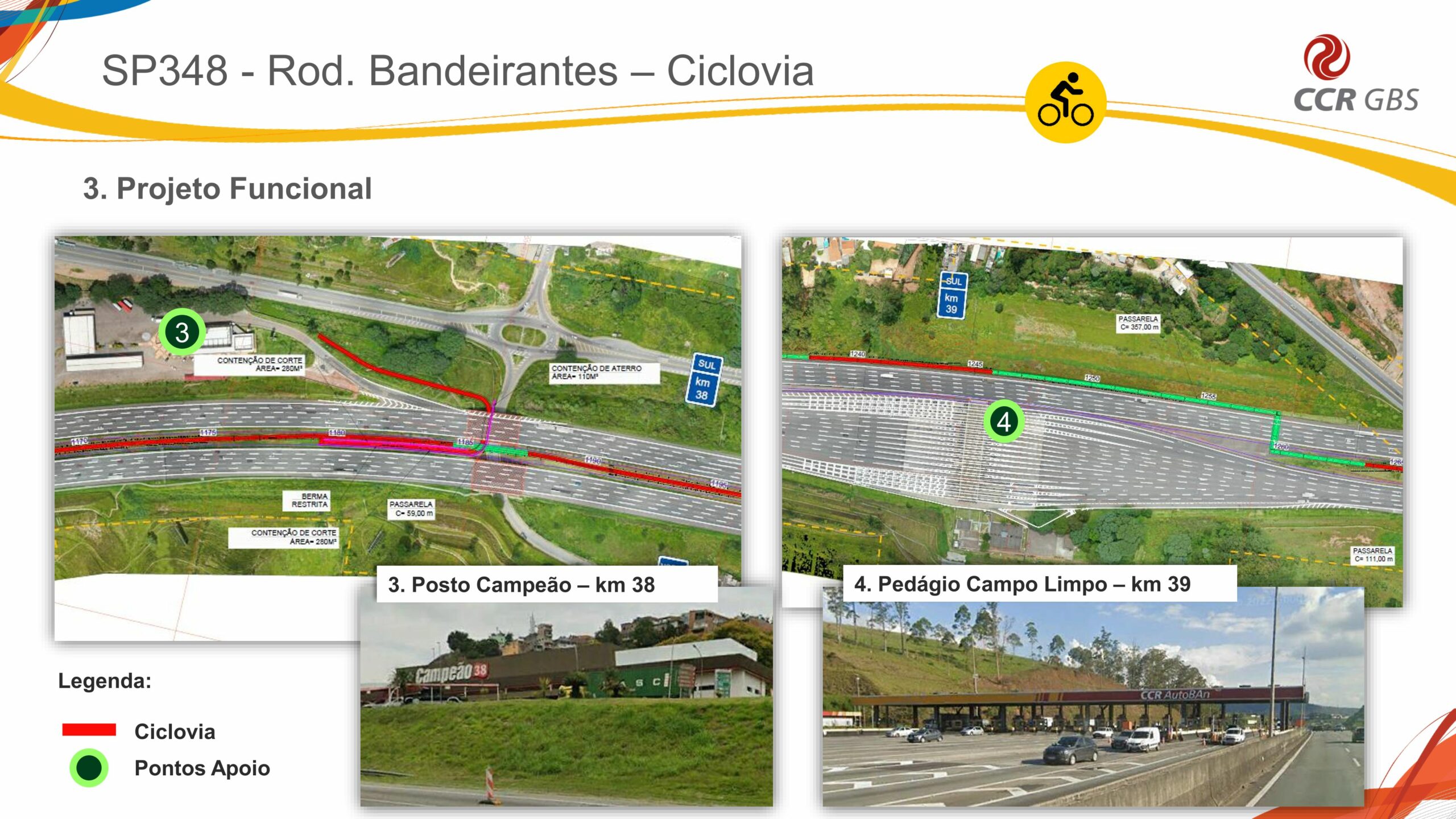 O Vá de Bike teve acesso a um documento que teria sido produzido pela própria CCR, apresentando o projeto funcional dessa ciclovia. O arquivo dessa apresentação tem 12 páginas, com dez delas mostrando detalhes do projeto da ciclovia da Rodovia dos Bandeirantes.